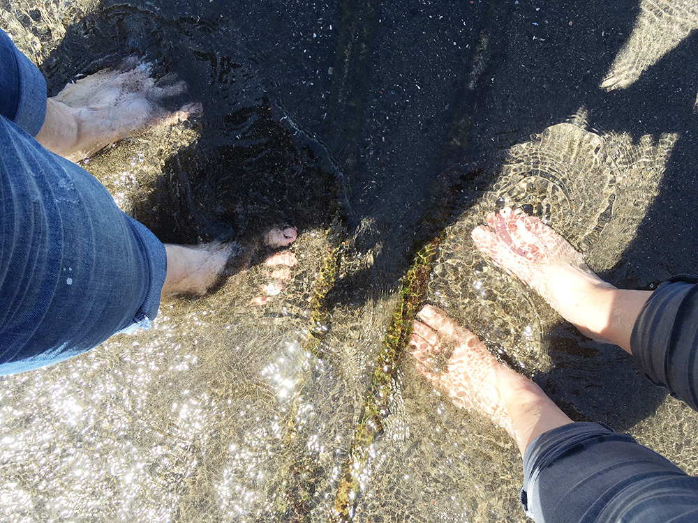 Wir stapften aber weiter zum Ministrand – der natürlich gut besucht war – zogen Socken und Schuhe aus und haaaaach… kühles Meer. Weicher Sand. Panorama genießen – den Typen mit der Bierwampe und Speedo direkt vor uns, wegdenken …. Wundervoll. Einfach mal stehn, atmen, den Moment genießen.
