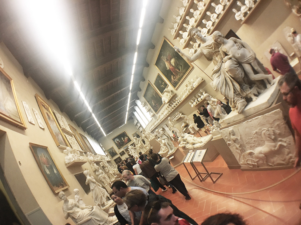 Schlange sah human aus. Wir stellten uns also an und waren tatsächlich keine halbe Stunde später dann auch drin. Ziemlich aufgeblasen das ganze. Gab 2 Räume. In einem Großen: David (vorher sah man auch noch n paar andere Skulpturen, aber ich wette, denen schenkt eigentlich keiner weiter Beachtung) und in einem zweiten, kleineren Raum, so … 100 weitere Statuten. Alle auf engstem Raum. xD